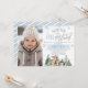 Blue And Silver Woodland Onederland 1st Birthday Invitation mignonne photo Bois bleu et argenté hiver une invitation de premier anniversaire sur le thème d'un derland comprenant quatre animaux boisés mignons, quelques pins, une bannière bleue, un cap de parties scintillant en argent décoratif et des flocons de neige. L'invitation à l'anniversaire d'un an d'hiver dans les bois de ce garçon comporte également des points de parties scintillant en argent et un dos rayé bleu et argent.