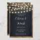 Bois rustique et voyants à cordes | Barn Mariage Card Célébrez votre grande journée avec ce faire-part de mariage rustique avec un arrière - plan de tableau noir, des lampes à cordes scintillantes et une typographie élégante. Parfait pour les mariages de grange, les réceptions en plein air et les fêtes rustiques chic. Modèle entièrement personnalisable avec vos détails.