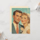 Une illustration romantique dans le style des années 50 d'un couple de jeunes mariés, rayonnant d'amour et habillé de tenue de mariage classique. L'image capture un sentiment intemporel de joie et d'élégance, parfait pour la décoration sur le thème rétro, l'inspiration de mariage ou la publicité vintage.