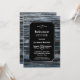 Une invitation à la retraite en bois de grange bleu et gris bordée d'argent rustique avec le texte blanc mis en surbrillance sur un arrière - plan noir.