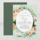 Belle invitation de fiançailles avec une élégante couleur pastel neutre aquarelle botanique cadre de verdure fleurie dans des tons doux de terre de pêche, orange, doux rougir, jaunes, et beaucoup de nuances de vert sauge à vert clair et profond. Vos détails personnalisés s'affichent dans une mise en page surélevée de typographie qui place l'invité d'honneur au centre.