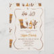 Boots Whimsical Champagne Hello 40 Anniversaire Invitation Whimsical pour l'anniversaire des femmes avec une botte de cowgirl, bouteille, verre et cactus en marron et orange. Cette invitation d'anniversaire présente également un cadre décalé avec des coeurs et des étoiles rétro.