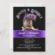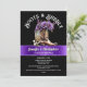 Une botte de cowboy marron en cuir à outils contient des fleurs florales violettes et a une flûte de champagne fantaisie à sa gauche au-dessus d'une bande horizontale violet faux qui semble briller et briller contre un arrière - plan noir. Les modèles de texte blanc modifiables peuvent être personnalisés pour convenir à votre célébration spéciale. Cet invitation téléchargeable élégant est idéal pour un événement spécial sur le thème occidental, "bottes et bling" de pays ou "bottes et bulles" aussi.