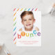 Cette invitation à la fête d'anniversaire de photo rebond comprend des lettres rebondissantes dans une palette de couleurs arc-en-ciel de rouge, orange, jaune, vert, bleu et violet avec l'âge modifiable dans l'O. Une prise super amusante, sans sexe sur un trampoline, gymnastique ou la fête de la maison rebond. Cette invitation est inspirée par tous les enfants qui aiment sauter, rebondir et voler.