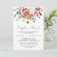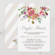Cette simple carte d'invitation à la douche aux couleurs florales bouquet est parfaite pour une douche de mariage classique et élégante. Le design se compose d'un agencement de pivoines roses, pêche et violettes avec hydrangées blanches, crème d'ivoire et support rayé blanc.
