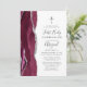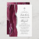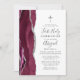 Le bord gauche de cette élégante invitation à la première communion moderne comporte une bordure d'aquarelle rouge bordeaux et ornée d'une parties scintillant en faux argent. Une fausse croix de feuille argent apparaît au-dessus du texte personnalisable, qui combine écriture manuscrite, cuivre et polices italiques en gris charbon sur un arrière - plan blanc. L'envers est assorti d'un design d'agate bordeaux et argenté.