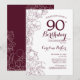 Invitation à la fête de 90e anniversaire de floraison bourguignonne. Design élégant en marsala vin et blanc avec des accents de dessin botanique et de script de typographie. Carte invitation simple et tendance, parfaite pour une célébration anniversaire élégante. Peut être customisé à n'importe quel âge. Invitations Zazzle imprimées ou téléchargement instantané modèle imprimable numérique.