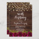Rouge bordeaux rustique, roses marsala aquarelle, arrangement floral botanique design mariage avec feuilles verts et lumières à cordes sur bois de grange brun foncé. Dispose d'un élégant design de typographie manuscrite. Idéal pour une fête d'anniversaire adulte pour elle : 13ème 15ème 16ème 18ème 20ème 21ème 30ème 40ème 50ème 60ème 70ème 80ème 90ème 100ème, ou tout âge. Veuillez noter que ce design est un effet photo imprimé sans bois. #3348