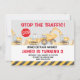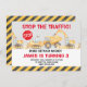 Boys Road Construction Stop La circulation Anniversaire Invitation Belle aquarelle invitation à l'anniversaire de construction du garçon sur le thème de la construction comprenant divers véhicules de construction lourde comme un camion à benne et une grue, ainsi qu'un panneau d'arrêt rouge. Ce design d'invitation est idéal pour une fête d'anniversaire à thème de construction pour garçon.