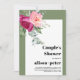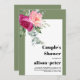 L'invitation à la douche du couple de mariages présente un cadre blanc minimaliste, son coin supérieur gauche agrémenté d'un délicat arrangement de branches d'eucalyptus et de roses aux tons roses. Une bordure verte à la sauge douce, encadrant trois côtés de l'invitation, fournit un cadre subtil mais élégant. La typographie audacieuse du texte assure clarté et importance, créant un contraste visuellement attrayant par rapport au thème floral muet.