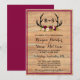 Cette invitation de mariage rustique présente un fond de planche de bois avec des bois de cerf ornés de fleurs. Parfait pour tout mariage champêtre ! Veuillez me contacter si vous souhaitez de l'aide pour la mise en forme de vos informations textuelles sur cette invitation de mariage.