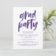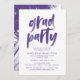 Invités Invitations pour célébrer la grade avec nos invitations modernes de la fête de graduation! Les invitations branchées à la fête de remise de diplômes comportent une "grande fête" dans une police de pinceau peinte en violet. Personnalisez les invitations créatifs de la fête de remise de diplômes en ajoutant le nom du diplômé, le nom de l'école, l'année de remise de diplômes et les détails de la fête de remise de diplômes. Les invitations s'inversent pour afficher un design de brosse violet et blanc.