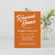 Dîner de répétition mariage de style simple, avec des lettres blanches et stylisées sur un arrière - plan tendance, couleur orange brûlé. Modifiez vos invitations en remplaçant les noms, la date/heure, l'emplacement et les coordonnées par les vôtres. Sélectionnez votre taille d'invitation et votre style de papier.