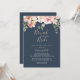 Ce brunch à l'eucalyptus avec l'invitation à la douche à la mariée est parfait pour un wedding shower moderne. Le design est composé de fleurs rose, blush, jaune rose avec des feuilles d'eucalyptus dans un arrière - plan bleu marine foncé.
