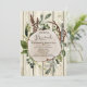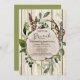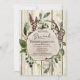 Une tranche de bois rustique avec verdure et plumes autour de l'invitation au brunch nuptial. Personnalisez facilement vos informations de fête.