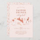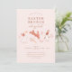 Carte d'invitation à la fête de Pâques avec lapins, carottes et fleurs.
