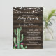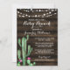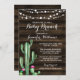 Une invitation rustique de douche de brunch de bébé de cactus parfaite pour une partie orientée de désert. Illustrations modernes de ce de caractéristiques de conception cactus d'aquarelle, lumières de ficelle et un arrière - plan en bois foncé.