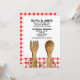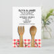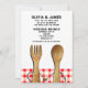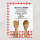 Fête de mariée et mariée, invitations de brunch ou de pique-nique avec un couple de fourche et de cuillère sur un arrière - plan en vichy rouge.