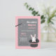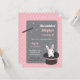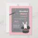 Une invitation avec une baguette magique et un mignon lapin blanc surgit d'un chapeau noir. Parfait pour cette fête d'anniversaire à thème magique ! Arrière - plan du motif pois. Palette de couleurs de blanc, noir, rose et gris.