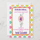 Une mignonne invitation d'anniversaire avec un lapin géant tenant un gros ballon rose flottant en l'air. Un petit oiseau bleu est assis au sommet du ballon, sifflant une chanson avec des petites notes de chanson accrochées à l'air. Réglez sur un arrière - plan dpt polka multicolore.