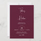 Cette élégante invitation de mariage présente un design minimaliste accompagné d'une belle écriture de script et d'une photo d'arc et d'une date avec un arrière - plan bordeaux. De plus, vous pouvez ajouter un code QR au dos pour diriger vos invités vers RSVP votre événement mariage. Vous pouvez customiser l'invitation avec votre photo et votre code QR — il suffit de le remplacer au dos par le vôtre dans la case "personnaliser ce modèle". Si vous devez modifier la couleur, vous pouvez customiser la carte d'invitation. Vous pouvez customiser et personnaliser l'invitation afin de répondre à vos besoins mariages et cliquez simplement sur personnaliser de l'invitation. Vous pouvez facilement personnaliser cette invitation avec votre propre texte et la partager avec vos invités numériquement - que ce soit par le texte, par e-mail, ou par les médias sociaux. Si vous préférez, vous avez également la possibilité de poster une version imprimée à vos invités. Ou, vous pouvez faire les deux : envoyer une version numérique et le suivi avec une copie imprimée pour une touche personnelle!