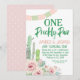 Cactus Twins One Prickly Pair Anniversaire Invitation Cette jeune fille jumelle l'invitation de premier anniversaire comprend un arrangement de cactus à fleurs roses, une bannière et de la calligraphie de brosse moderne en tête d'image.