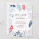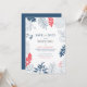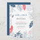 Cadre de fleurs et feuilles tropicales en bleu marine avec un cadre rouge corail, modèle d'invitation personnalisable pour annoncer la date de votre mariage.