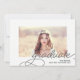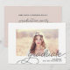Une invitation simple et chic pour la fête de remise de diplômes comporte votre portrait favori de fin d'études ou photo de graduation encadré par une épaisse bordure blanche, avec "diplômé" superposé dans le coin inférieur droit en écriture calligraphique élégante. Personnalisez avec votre nom, année de promotion et école en dessous, et ajoutez les détails de votre invitation de fête de remise de diplômes au verso sur un fond rose tendre.