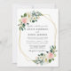 Invitation de mariage moderne élégante aquarelle rose florale verdure comprend des roses blanches roses et autres verdures magnifiques. Cadre géométrique doré.