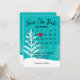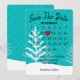 Calendrier "Sauver la date" avec cœur rouge sur fond sarcelle avec flocons de neige et arbres pour un mariage imminent.