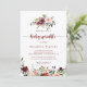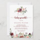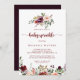 Cette invitation à la calligraphie florale d'été rustique est parfaite pour un baby shower moderne. Le design est composé de fleurs d'aquarelle bordeaux, roses et rousses avec des feuilles verts dans un arrière - plan verni brun.