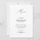 Ambiance pour une expérience gastronomique inoubliable avec ce menu Mariage romantique de Calligraphie moderne. Conçu avec un script aéré et fluide associé à une disposition épurée et minimaliste, ce menu capture l'essence du romantisme moderne. Idéal pour un dîner-réception élégant, un mariage de jardin ou une soirée chic, il allie élégance et chaleur. Chaque cours est magnifiquement présenté, afin que vos invités se sentent accueillis et excités pour les délices culinaires à venir. Que votre ambiance soit noir et blanc intemporel ou neutre, ce menu ajoute une touche gracieuse à votre table : un détail digne d'un souvenir qui cravate tout ensemble.