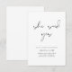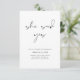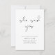 Dites-le avec style : Elle a dit oui ! Cette invitation unique de fiançailles présente une calligraphie moderne dans un design noir et blanc propre. Minimale mais élégante, c'est la façon parfaite d'annoncer votre fête avec charme et simplicité, sans avoir besoin d'une photo. C'est un très beau choix pour les couples boho, classique ou moderne qui souhaitent organiser un événement design à moindre coût.