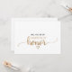 Cette simple carte d'honneur de calligraphie or est parfaite pour un mariage moderne. Le design minimaliste présente une police élégante de caractères de brosse à feuille d'or et un coeur féminin. Le dos est vide, vous aurez donc beaucoup de place pour écrire une note personnalisée réfléchie.
