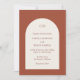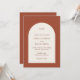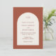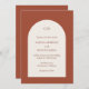 Faire-part de mariage moderne avec votre monogramme et vos détails à l'intérieur d'une arche couleur crème sur un arrière - plan rouille. Ce design simple mais élégant aux couleurs terreuses du désert conviendra parfaitement à un mariage de style boho en été ou en automne.