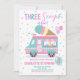 Jolie invitation d'anniversaire en style. Thème : Crème glacée - 3 Scoops of Fun. Occasion : Enfant Fille 3ème anniversaire fête. Style : Mignonne, Gaie, Amusante, Élégante. Couleurs : Rose, Violet, Turquoise, Blanc. Graphiques : Crème de glace, Camion Crème de glace, Balloons Pastel, Pois.