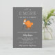 Invitation de baby shower sur le thème du camping mignon avec une illustration d'un feu de camp avec des s'mores. Le texte dit "la vie est plus amusante avec un bébé !"