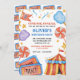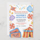 Venez un, venez tous pour le plaisir de la foire! Joli et coloré, cette invitation anniversaire de enfant à la fête est votre ticket pour tous les divertissements du cirque ou carnaval avec grand top, des billets et des bonbons. Facile à personnaliser et adapté à l'anniversaire d'un garçon ou d'une fille à la maison ou dans un centre de jeux.