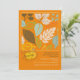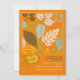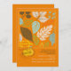 Une invitation à la feuille d'automne lumineuse et joyeuse avec des feuilles blancs, bleus, jaunes, verts et marrons contre un arrière - plan orange. (Vecteezy.com - Modèles vectoriels de cartes d'automne et d'automne par happymeluv).