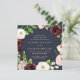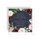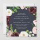 Notre faire-part de mariage Blush Romance, en forme de carré, entoure vos détails du jour de mariage d'une couronne de fleurs d'aquarelle en ivoire, marsala bordeaux et rose vif, accentuée de feuilles botaniques verdoyants et de feuillage contre un riche arrière - plan bleu nuit.