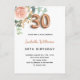 Une élégante invitation pour une fête de 30e anniversaire. Un arrière - plan blanc chic. Décoré d'or rose et de rose pastel rose vif, de fleurs roses, de feuilles d'eucalyptus verts, de sprigs, de verdure et de faux sprigs d'or. Personnalisez et le nom et les détails du parti. Lettres noires et dorées. Le nom est écrit avec un script de style moderne écrit à la main. Le numéro 30 est écrit avec une police de style ballon doré. Retour : Couleur arrière - plan rose or, design carte postale. Conseil : Si vous ne voulez pas qu'il ressemble à une carte postale, cliquez sur customiser, allez à l'arrière et retirez le séparateur et le timbre postal.