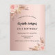 Pour une fête d'anniversaire moderne de style boho 21ème (ou tout âge). Un arrière - plan rose en or. Décoré de fleurs roses d'or et de rose, de roses et d'herbe de pampas. Personnalisez et ajoutez un nom et des détails du parti.