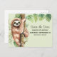 Enregistrez la date anniversaire / baby shower / autre carte postale de l'événement avec un design d'aquarelle mignon avec un paresseux mignon accroché à une branche d'arbre entouré de feuilles tropicaux verts. Une frontière de feuilles tropicaux verts le long du sommet. Arrière - plan vert olive clair.