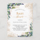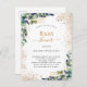 Bienvenue dans un Baby shower élégant. Un arrière - plan blanc chic. Décoré avec des feuilles d'eucalyptus couleur verte, sprigs, verdure, feuilles faux or et poussière de parties scintillant dorée. Personnalisez et ajoutez le nom de la mère à être et détails paraty. Lettres noires et dorées. Conseil : Si vous ne voulez pas qu'il ressemble à une carte postale, cliquez sur customiser, allez à l'arrière et retirez le séparateur et le timbre postal.