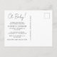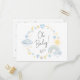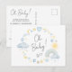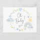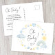 Carte postale d'invitation pour bébé boho Whimsical qui présente des aquarelles bleues et jaunes d'un arc-en-ciel, soleil, coeurs, étoiles, lunes et nuages, et "Oh bébé!" dans un script élégant. Sur le dos, personnalisez le nom de la future mère et les détails de la douche dans une simple typographie moderne.