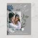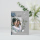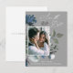 Ce beau mariage rustique aquarelle fleurie une photo enregistrer la date carte postale présente un script de calligraphie en lettres blanches et un bouquet de bouho bleu et blanc sur un arrière - plan gris doux.