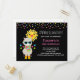 Carte postale d'invitation à la fête d'anniversaire avec un lama à l'allure cool portant des lunettes de soleil foncées. Habillé d'un foulard rayé coloré et de petites bottes amusantes. Un soleil jaune vif avec un joyeux visage kawaii dans l'arrière - plan. Des triangles pleins de couleurs géantes entourent ce lama amusant. Arrière - plan noir.
