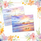 Belle aquarelle d'un lever de soleil de plage avec des rayons colorés de lumière dans le ciel qui se reflètent également dans les vagues de l'océan. Image plus claire sur le dos avec du texte personnalisable pour les informations RSVP.