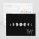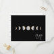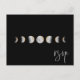Cartes de réponse de mariage à phases de lune aquarelle dorée. La carte présente une illustration de phase de lune sur fond noir, un graphique de script "rsvp" blanc, un cadre d'adresse de fleurs sauvages au dos et plusieurs lignes pour vos informations de réponse personnalisées.