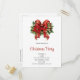 Carte postale d'invitation de Noël avec une Bow de Noël festive en rouge et or. Entourée de fleurs de poinsettia, de décorations de pin et de Noël.